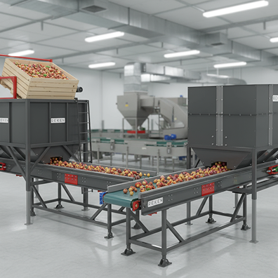 Bufory dozujące REKEN stabilizują przepływ surowca między poszczególnymi etapami linii technologicznej. Dzięki precyzyjnej regulacji prędkości taśmy (falownik) i dużej pojemności zbiorników zapewniają równomierne podawanie warzyw, eliminując skoki wydajności i przestoje. W zależności od konfiguracji linia może być wyposażona w klasyczne bufory BD-1 / BD-4 / BD-6 lub w zaawansowany bufor z wywrotnicą skrzyniopalet KD, który łączy funkcję magazynowania i rozładunku w jednym urządzeniu.