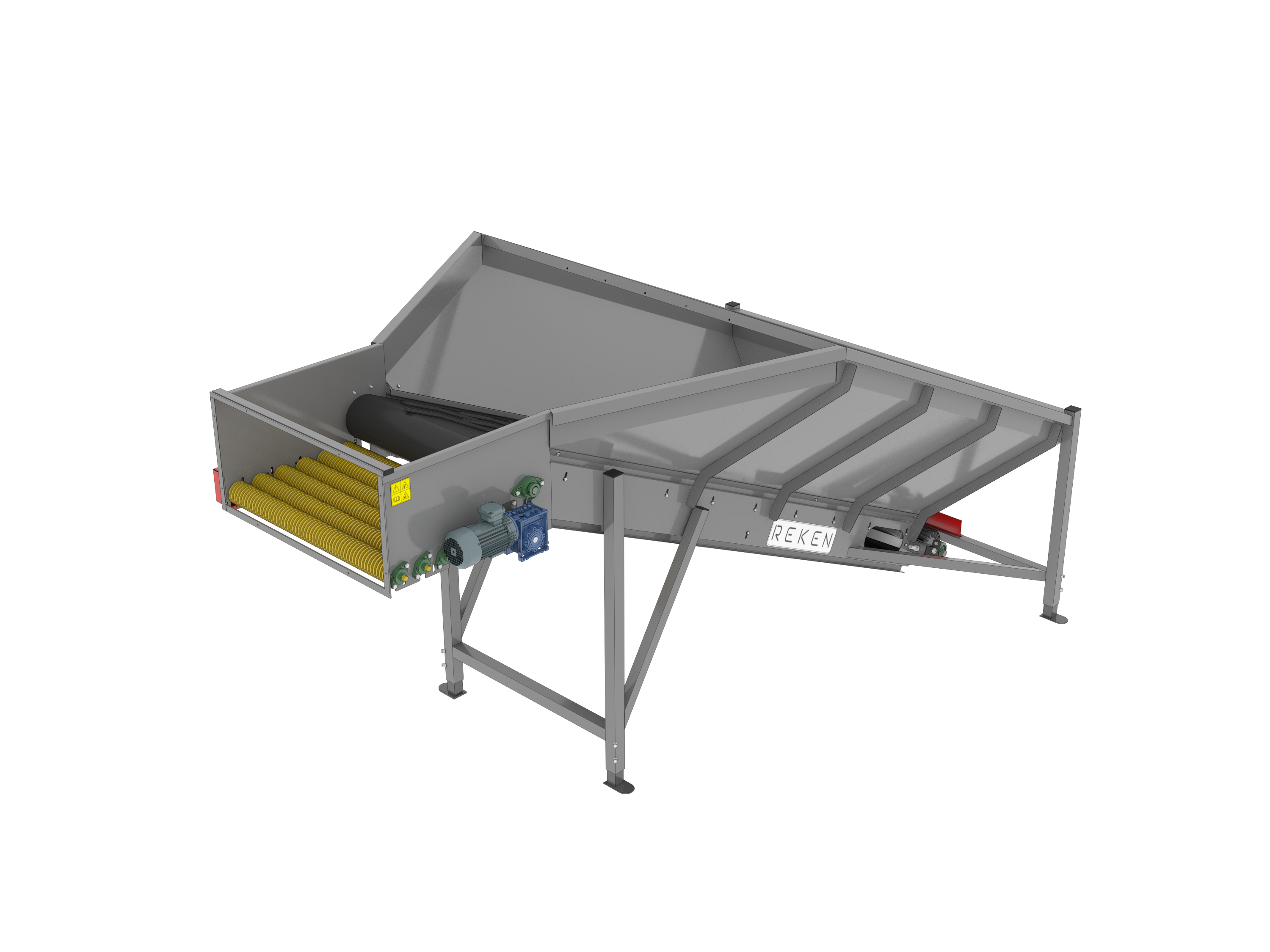 Kosze przyjęciowe REKEN umożliwiają szybkie i bezpieczne przyjęcie towaru z przyczep lub skrzyniopalet. Zapewniają równomierne dozowanie surowca i stabilny przepływ produktu już od pierwszego etapu procesu.