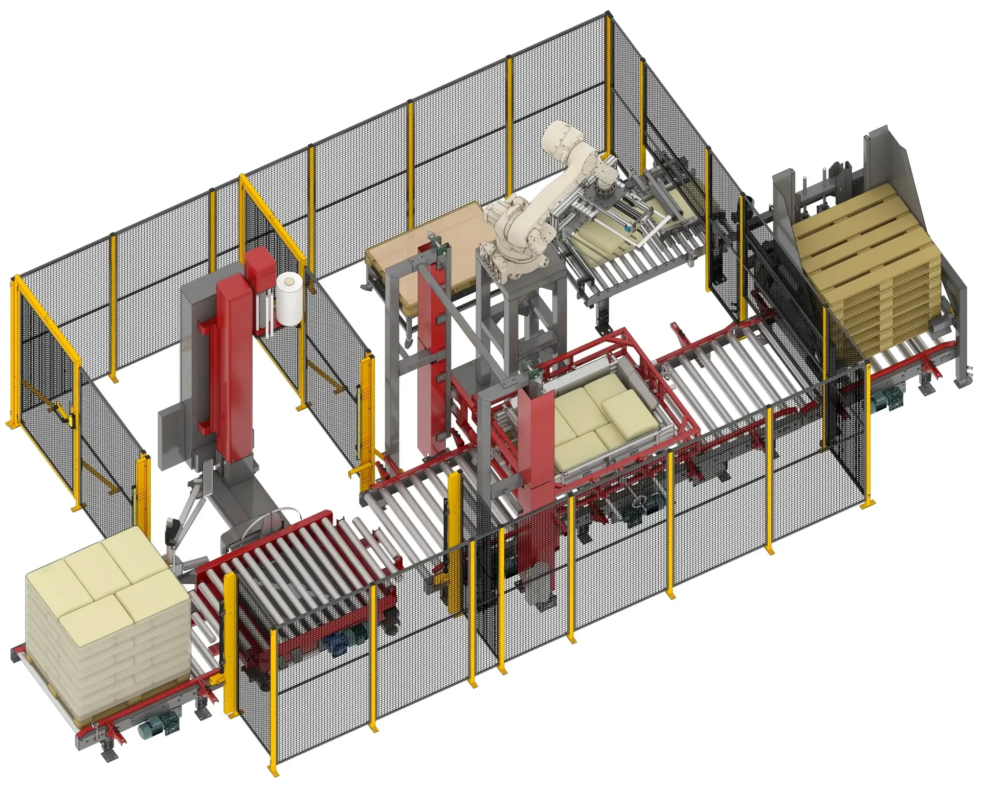 Systemy paletyzacji i owijania współpracują z urządzeniami pakującymi REKEN, tworząc w pełni zautomatyzowany ciąg końcowy.
