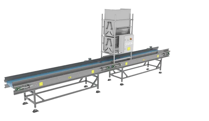 Sekcja ważenia i pakowania REKEN składa się z modułów wagowych, stacji zasypowych i urządzeń pakujących. Proces rozpoczyna się od precyzyjnego odmierzenia porcji warzyw, które następnie są automatycznie kierowane do odpowiednich opakowań. Całość może pracować w trybie ciągłym lub porcjowanym, w zależności od wymagań produkcji.
